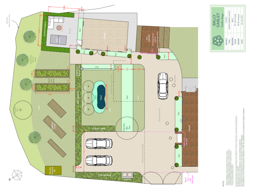 This garden has the most wonderful rural setting, with views of the open fields beyond. However the front garden lacked any sense of arrival and needed a re-think.  The clients had recently built a teen hangout garden room, plus the old garage and existing greenhouse added to a lack of cohesion.