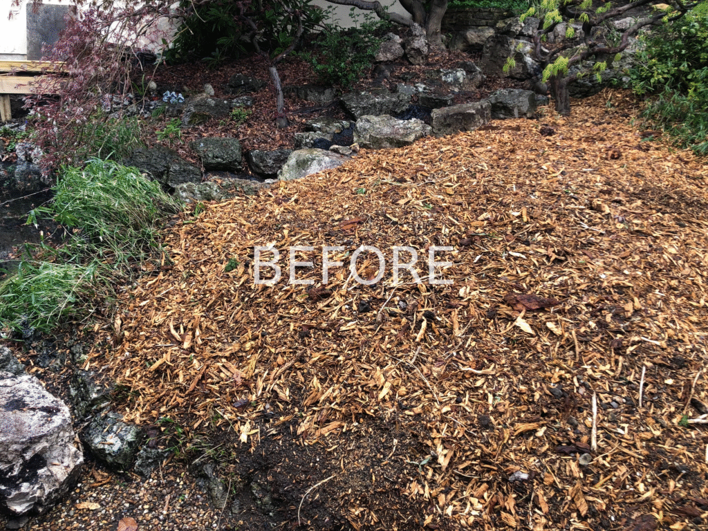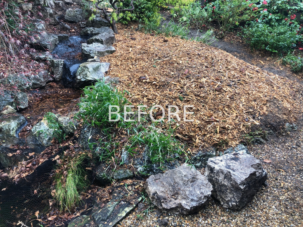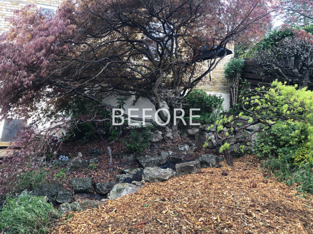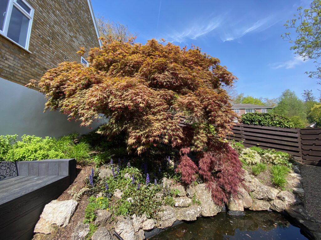 A sloping site, existing water feature with huge central Acer and a brief to overhaul the planting and bring some cohesion and colour.